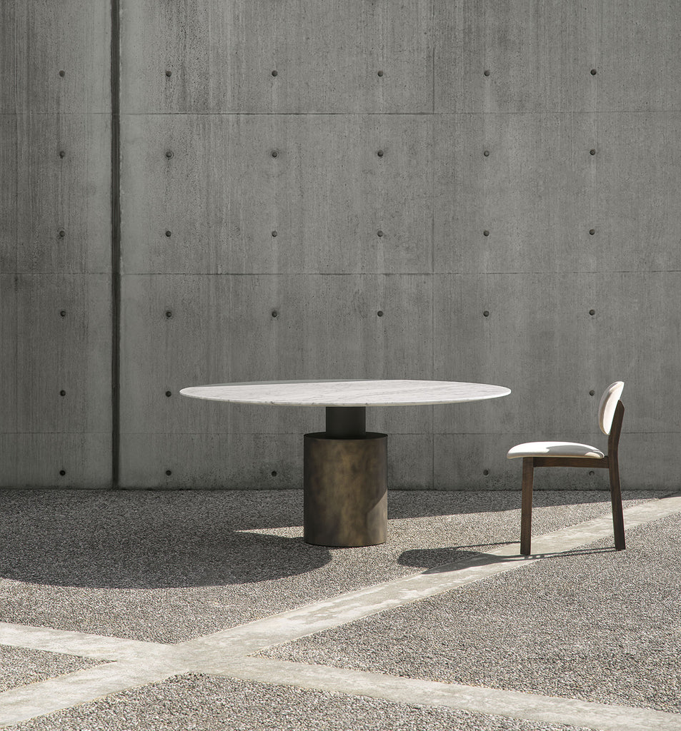 Table top in white Arabescato marble and cylindrical orbital bronze finish tube base