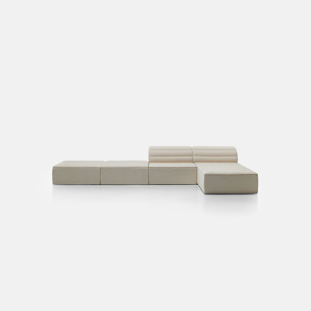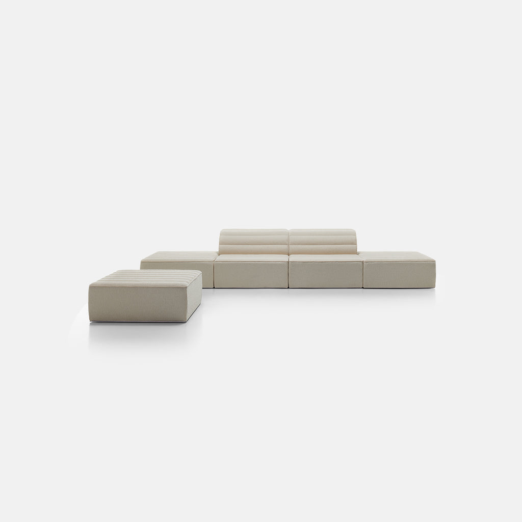 Upholstered furniture system with modular elements on a supporting structure of solid wood and plywood, base with elastic straps, feet and concealed coupling system. Padding in single-density polyurethane foam and polyester wadding.