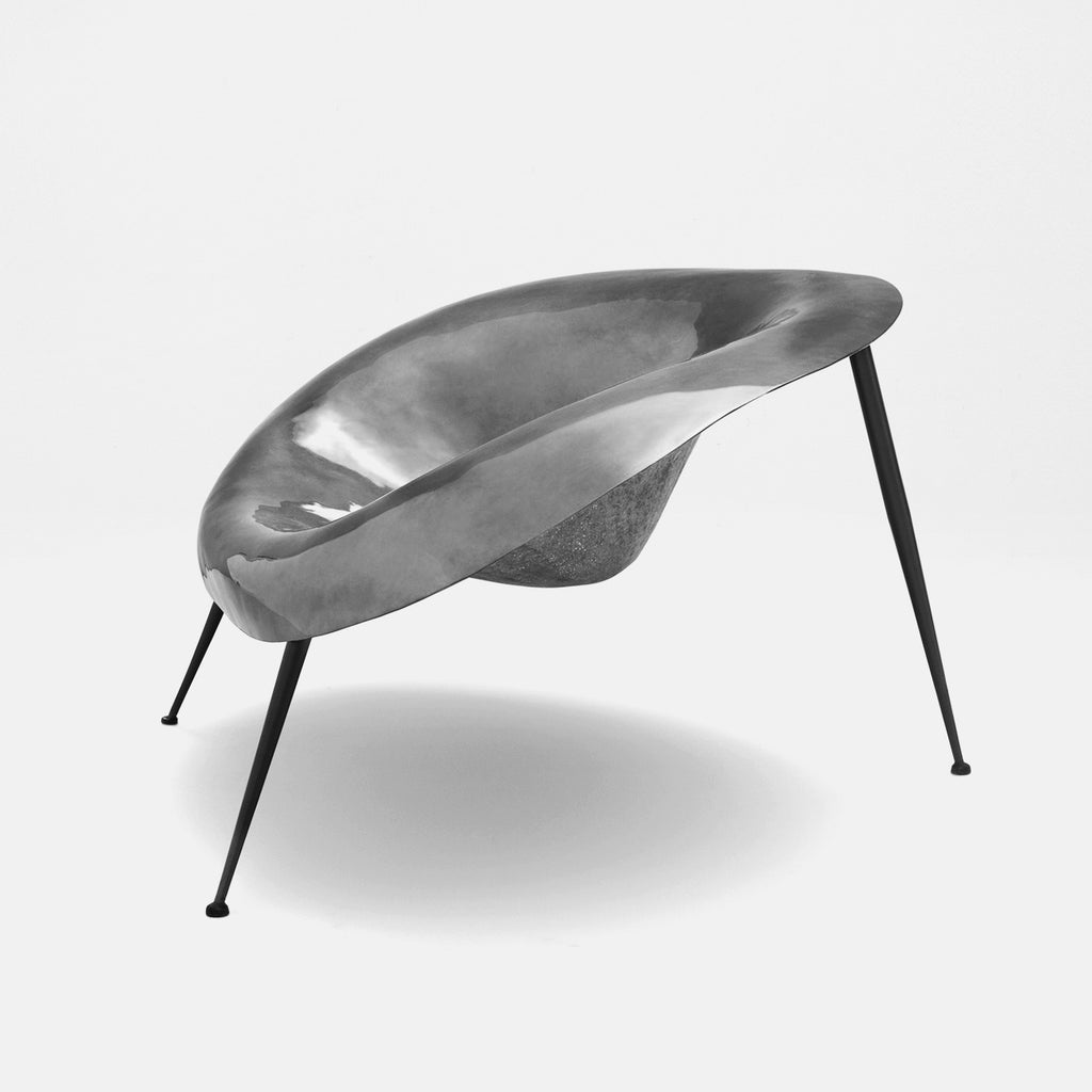 Kalkeriet Contemporary is pleased to present Nido Chrome lounge chair by artist and designer Verter Turroni. His artistic workshop Imperfetto Lab is located in Gambettola, Emilia Romanga, Italy. The studio was founded in 1992, by Turroni and his wife Emanuela Ravelli. Each exclusive piece is made from a common mould, which is then sanded, painted, and hand-polished. The working process differs for each type of object, thus becoming unique in its genre. Their pieces is mainly manufactured in fiberglass, a highly versatile lightweight material that is resistant to any weather conditions, suitable for both indoor and outdoor use. Available in a wide range of formulations, fiberglass couples the formability of plastic with the strength of glass. Pound–for–pound, fiberglass is even stronger than steel or aluminum. Imperfetto Lab combines exceptional attention to detail with first-class craftsmanship, making each design a work-of-art. Their own gallery promotes a wide range of art research projects, and organizes exhibitions and performances. Since 2001, it has been a place where artists can experiment with and validate their work.