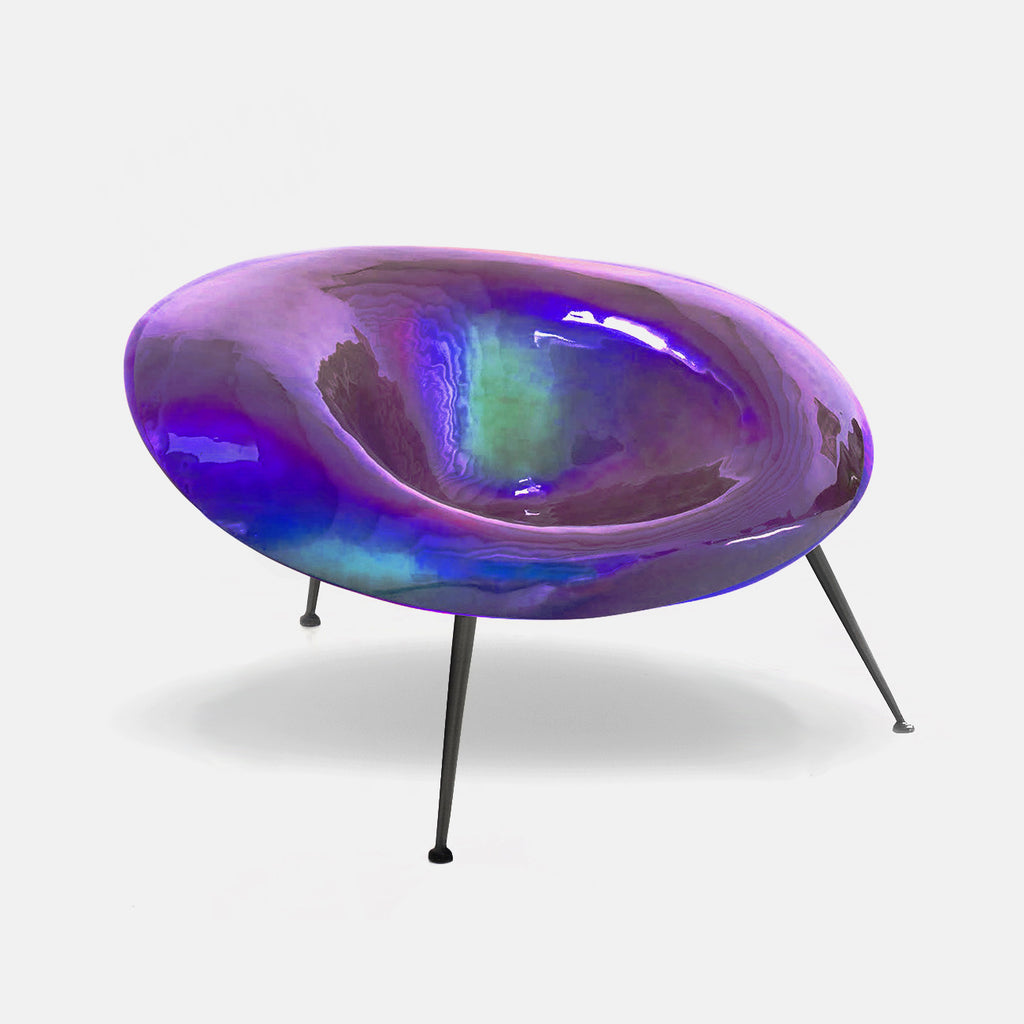 Kalkeriet Contemporary is pleased to present Nido Purple Iridescent lounge chair by artist and designer Verter Turroni. His artistic workshop Imperfetto Lab is located in Gambettola, Emilia Romanga, Italy. The studio was founded in 1992, by Turroni and his wife Emanuela Ravelli. Each exclusive piece is made from a common mould, which is then sanded, painted, and hand-polished. The working process differs for each type of object, thus becoming unique in its genre. Their pieces is mainly manufactured in fiberglass, a highly versatile lightweight material that is resistant to any weather conditions, suitable for both indoor and outdoor use. Available in a wide range of formulations, fiberglass couples the formability of plastic with the strength of glass. Pound–for–pound, fiberglass is even stronger than steel or aluminum. Imperfetto Lab combines exceptional attention to detail with first-class craftsmanship, making each design a work-of-art. Their own gallery promotes a wide range of art research projects, and organizes exhibitions and performances. Since 2001, it has been a place where artists can experiment with and validate their work.