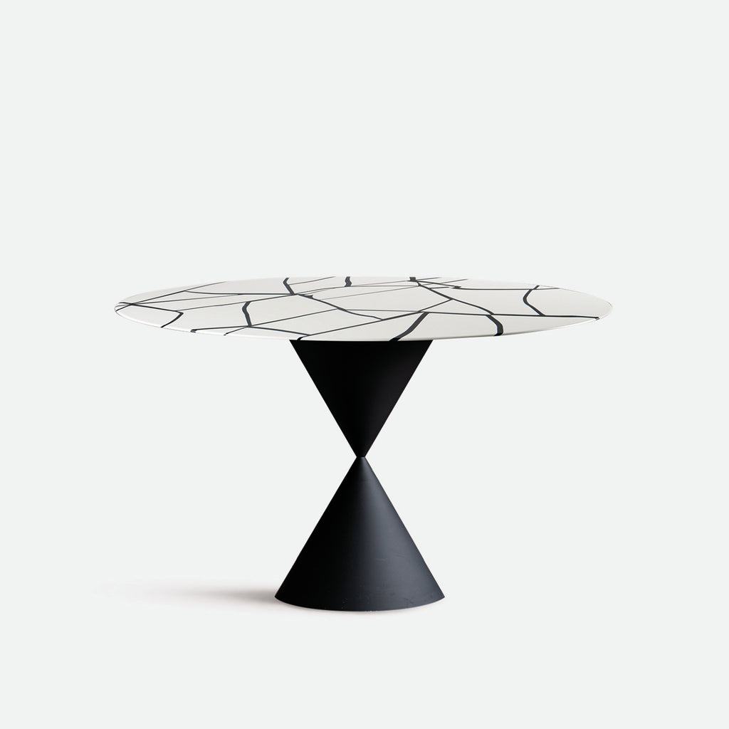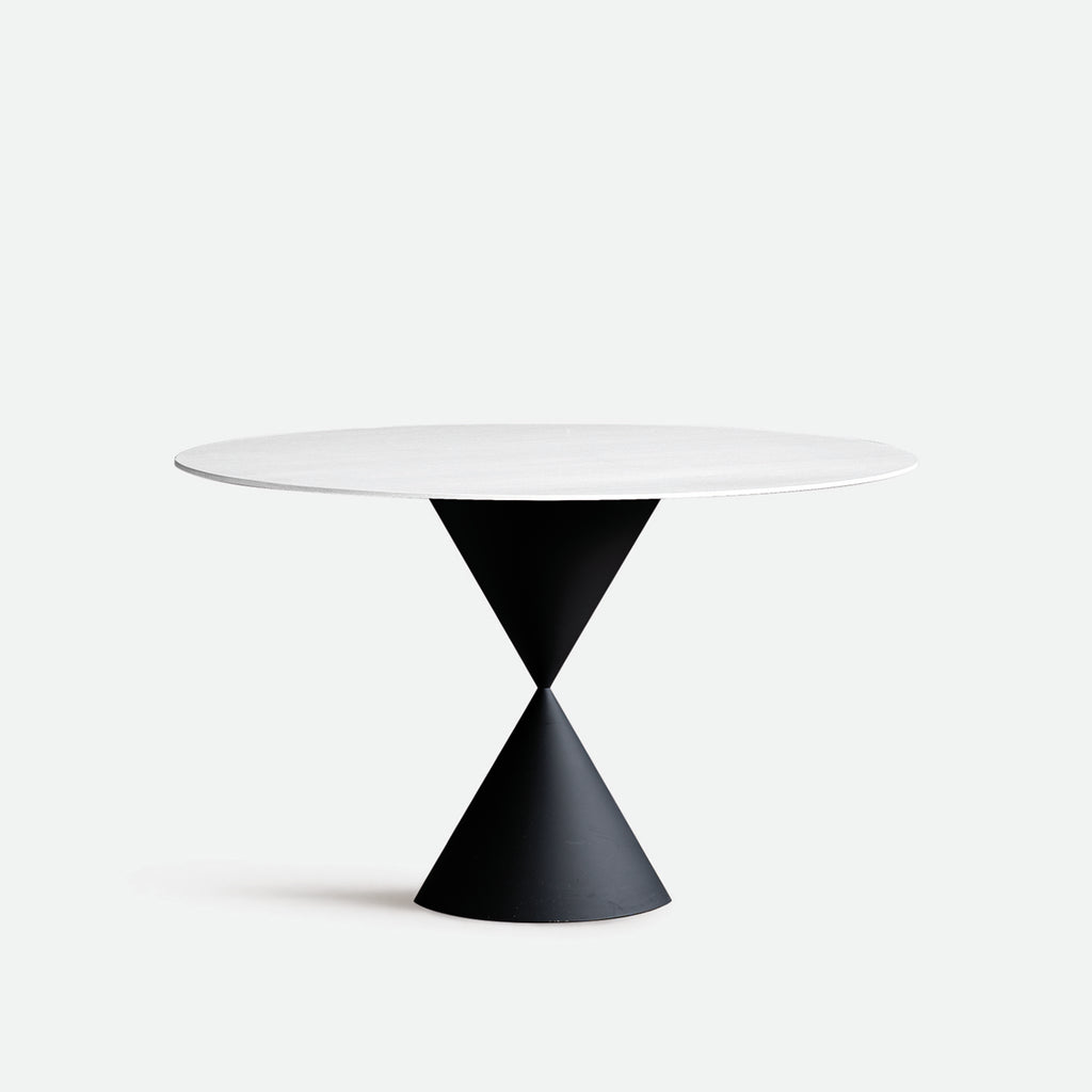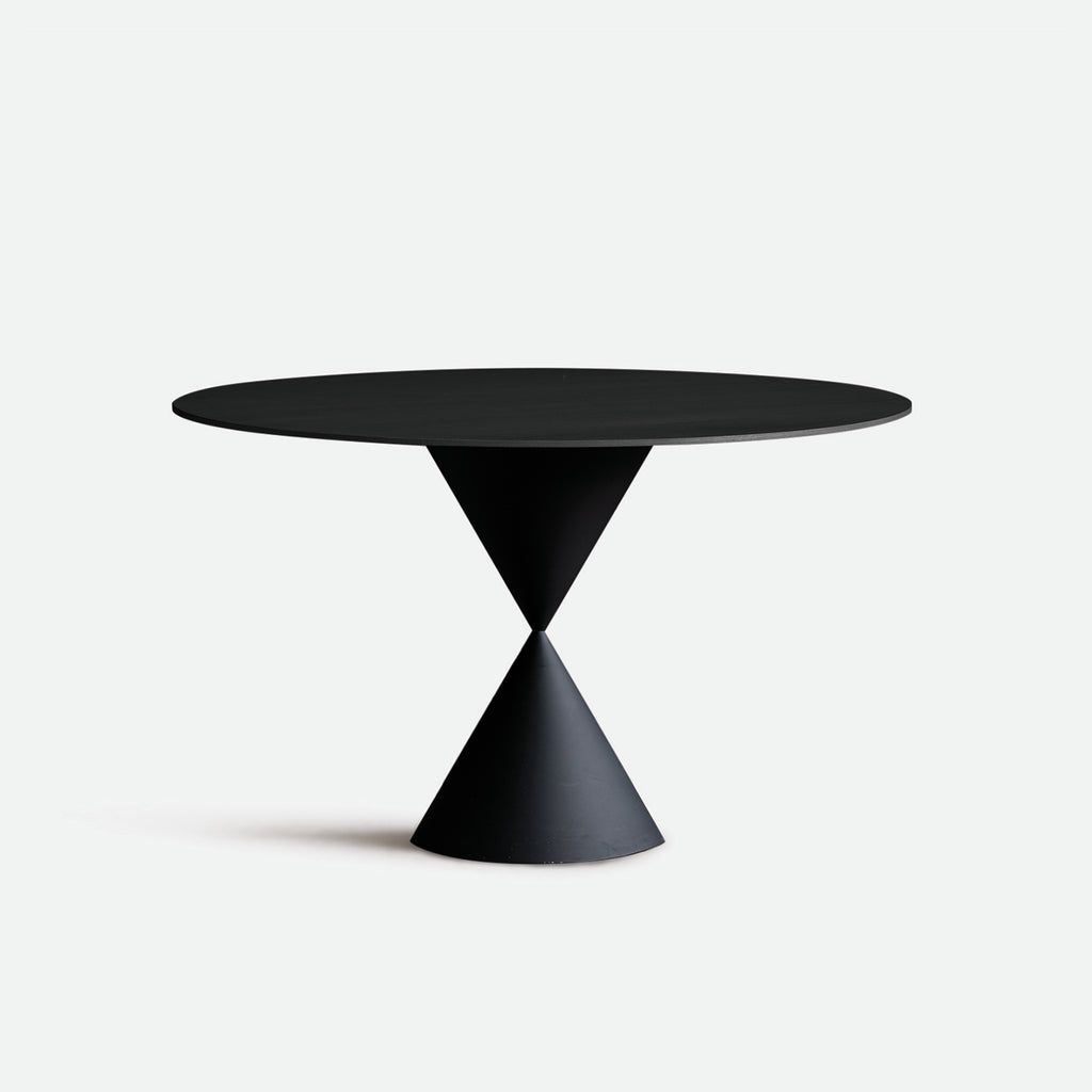 The Con-tatto dining table is characterized by its striking design, featuring two inverted cones crafted from black steel. These cones, with their identical proportions, create a visual balance that is both captivating and harmonious. The cones seem to attract each other, meeting at the top to form a singular, indivisible structure that embodies unity and strength. This innovative design approach ensures that the table is not only a piece of furniture but also a statement of artistic intent.