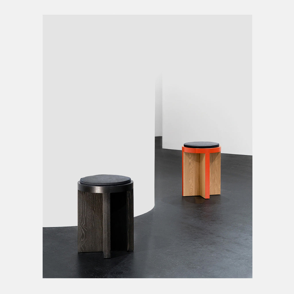 Kalkeriet Contemporary is excited to present Tabu by Ann Demeulemeester, a striking exploration of minimalist design. This stool features a robust cross-shaped base and a circular seat, embodying simplicity while showcasing bold, geometric elegance. Tabu is available in distinctive color and upholstery combinations: black oak with a black cushion, natural oak with a black pad, and natural oak with vibrant orange edges and a black cushion. Each variation highlights the geometric purity of its design, allowing you to select the perfect match for your space.