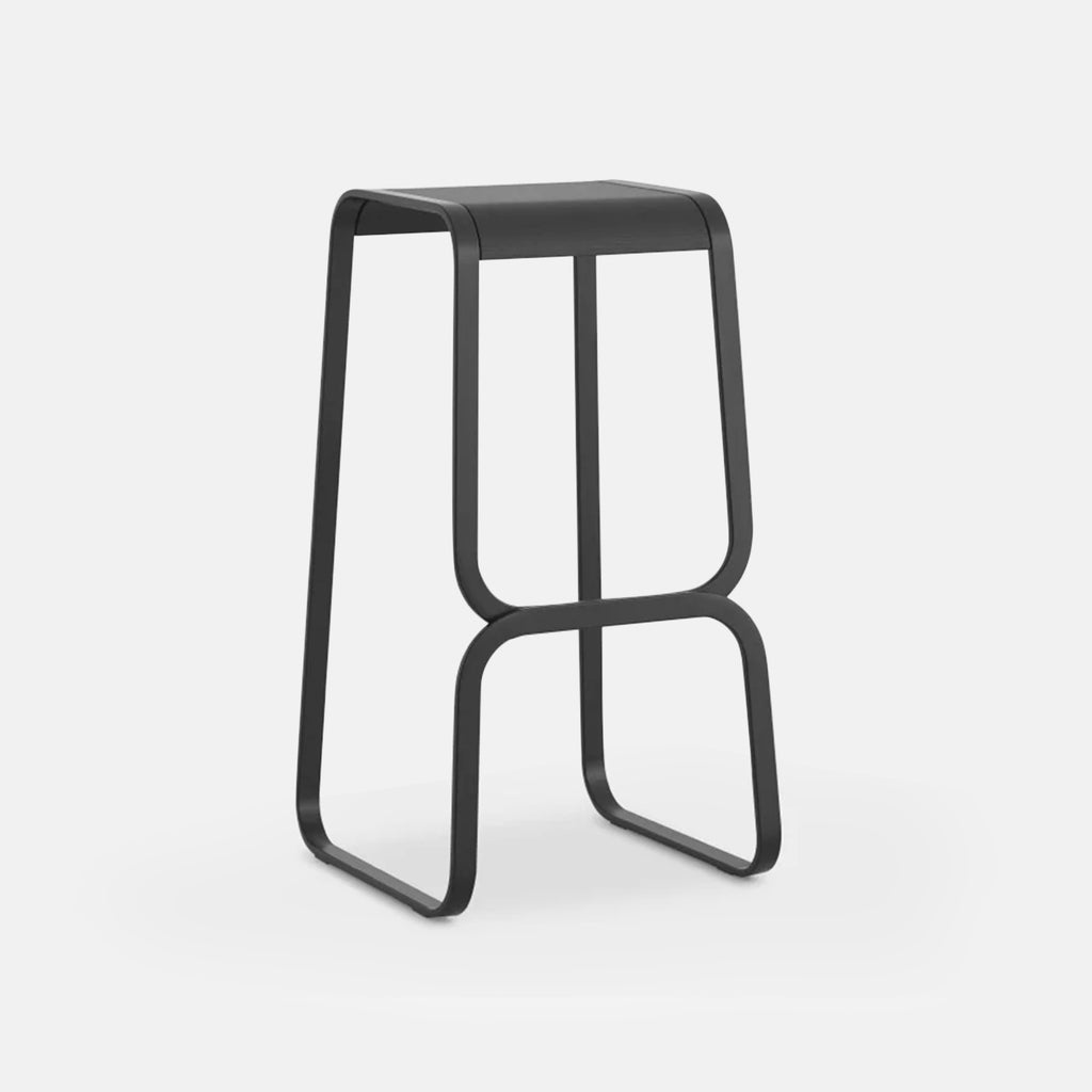 Stool with frame in powder coated steel and seat in curved plywood, available in different finishes. Two different heights.