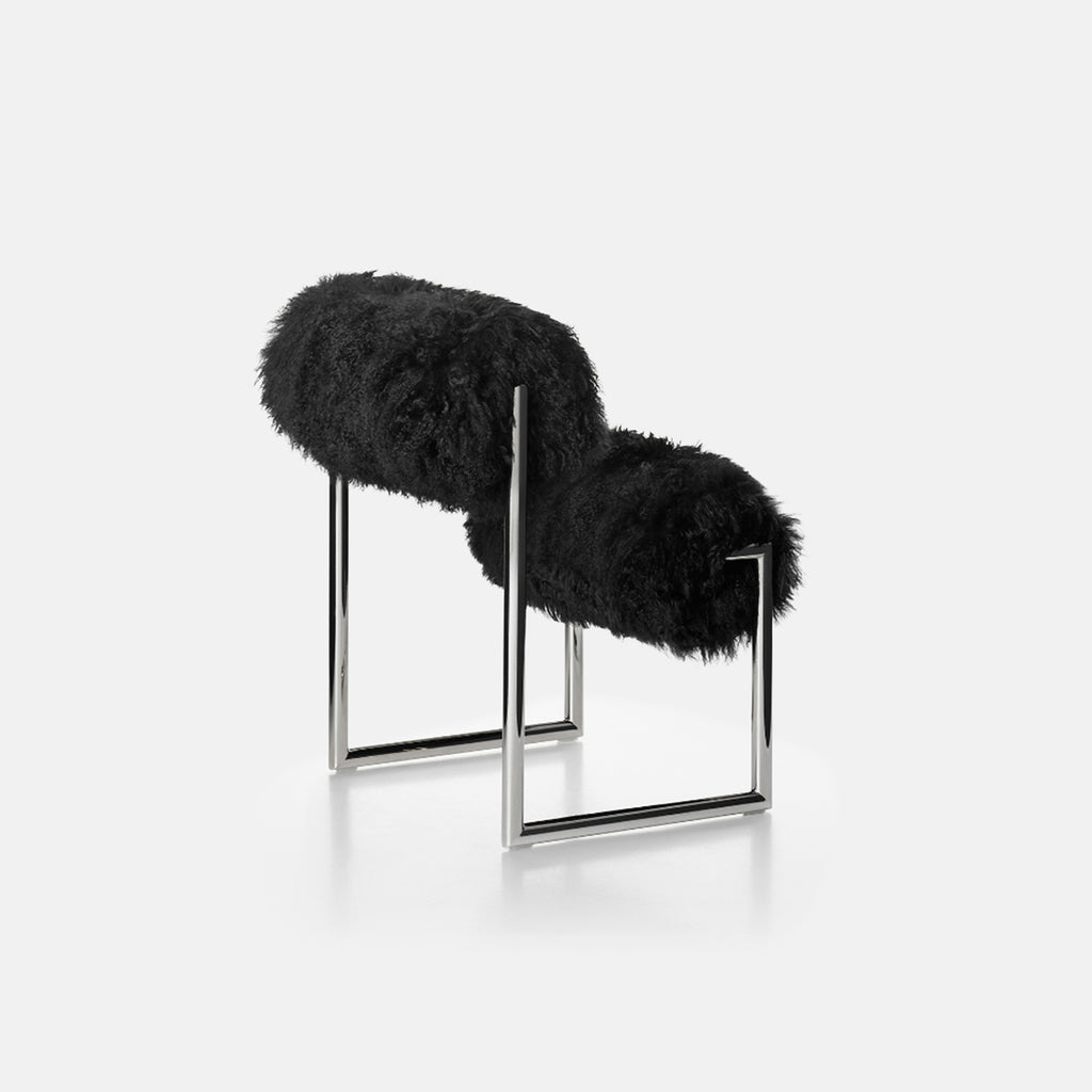Kalkeriet Contemporary is pleased to present Due Più by Nanda Vigo for Acerbis. Vigo’s armchair is an astonishing, enigmatic object where the use of two rollers that look like they’re floating makes for truly unique features. Futurist in aspect, we can see it as an emblematic design blending Vigo’s two souls: the esprit de géométrie that shines through the minimalist metallic structure with its light reflection, and an eccentric, pioneering spirit apparent in the use of Mongolian fur. Currently presented by Acerbis with a steel frame and furs reclaimed from food industry waste, according to circular economy principles that make it compatible with contemporary ethics.