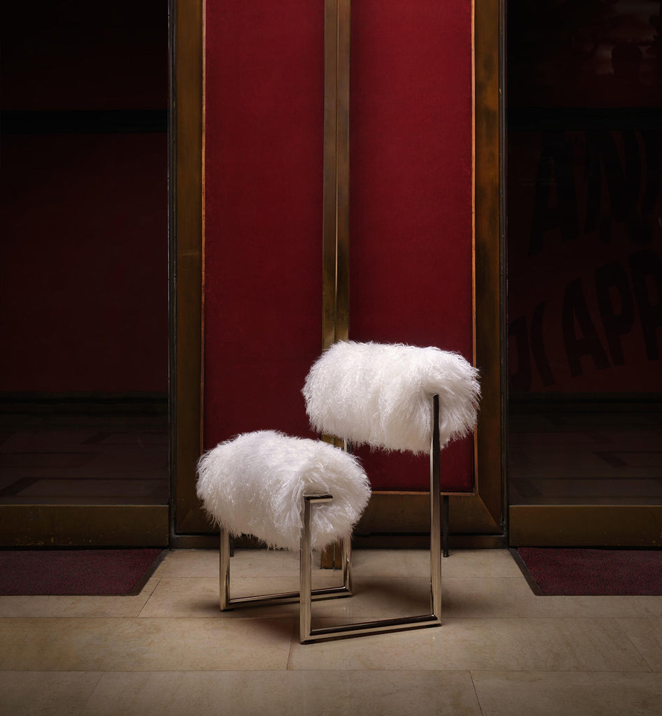 Kalkeriet Contemporary is pleased to present Due Più by Nanda Vigo for Acerbis. Vigo’s armchair is an astonishing, enigmatic object. Futurist in aspect, we can see it as an emblematic design blending Vigo’s two souls: the esprit de géométrie that shines through the minimalist metallic structure with its light reflection, and an eccentric, pioneering spirit apparent in the use of Mongolian fur. Currently presented by Acerbis with a steel frame and furs reclaimed from food industry waste, according to circular economy principles that make it compatible with contemporary ethics.