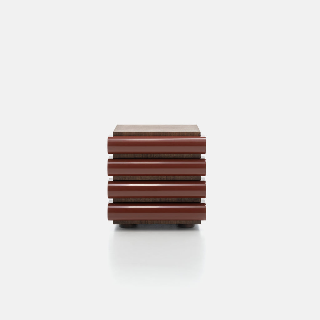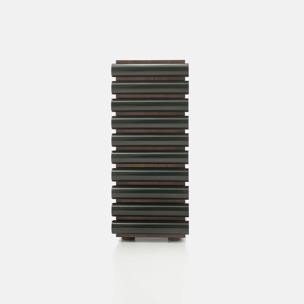 Kalkeriet Contemporary is pleased to present Storet by Nanda Vigo for Acerbis. A playful and spirited column of drawers, the Storet chest reflects the visionary design of Nanda Vigo. Available as a tall vertical piece or a compact nightstand, it blends timeless character with contemporary craftsmanship. The visible walnut grain showcases Acerbis’s expertise in working with expansive wood surfaces—offered in dark-stained walnut, black ash, or matte lacquer. Glossy lacquered drawers, available in the iconic Acerbis palette.