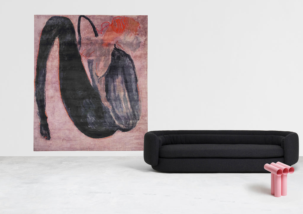 Vanessa Beecroft’s work has been shown internationally since 1993, and has shaped performance art, the representation of the female body, and the sociopolitical discussions of art. Her performances have been an ongoing practice for over twentyfive years. Presented across some of the world’s preeminent museums and major contemporary events, Beecroft’s performances highlight the tensions between nakedness and clothing, constraint and freedom, the collective and the individual, and human strength and weakness. Beecroft's collaboration with Henzel Studio was initiated in 2018 during a period when Beecroft returned to the origins of her classical training and immersed herself completely into painting and sculpture that materialized her performances and turned them into objects. One of these paintings of a distorted female figure was selected to be appropriated into a and knotted rug. The stunning end-result was achieved through painstaking work that spanned more than 2 years, where variable pile-heights and material compositions were applied to achieve a painterly effect directly referencing the original work.